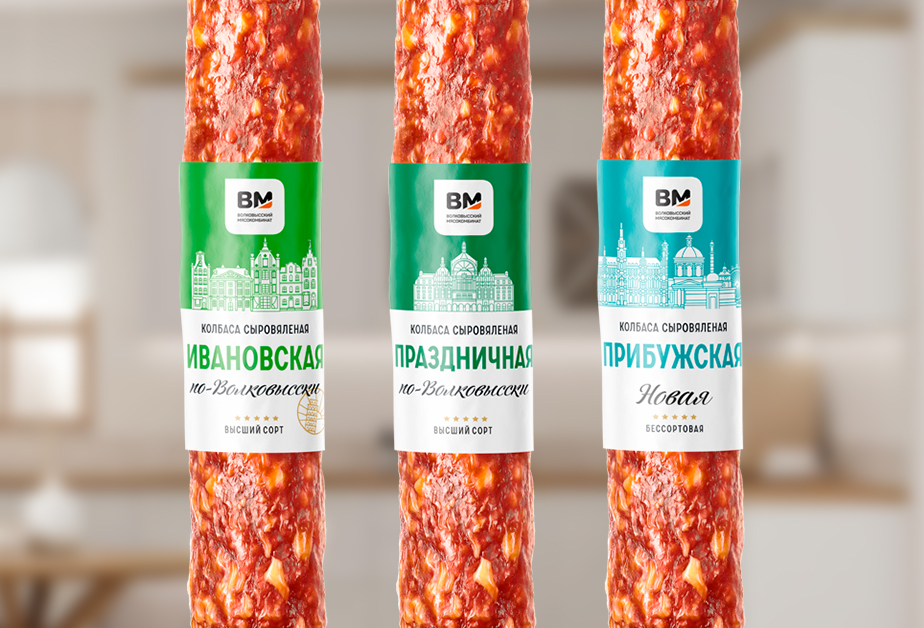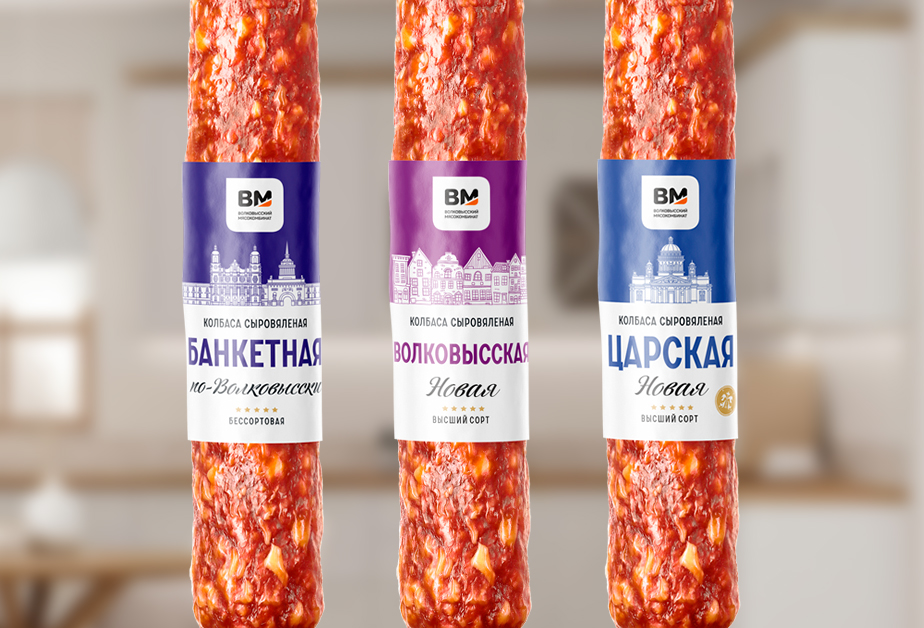 Разработать дизайн упаковки нескольких линеек колбасной продукции